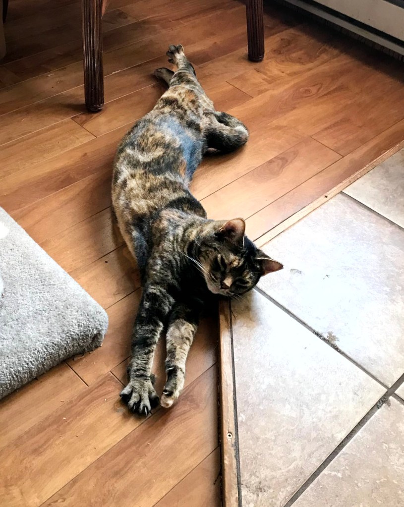 However little breakthroughs have occurred. Most extraordinary was the time she stretched out her front paws to me, claws extended. They were shaking a little. I dared to snip a tip off one claw but it was nerve wracking. My vivid imagination suggests that she knows I what I want but she can’t bring herself to comply, even though she wishes she could. I have also shown her pretend clips on my own hand so she knows what the clippers are for. And I have stroked her paw tops with the clippers too.