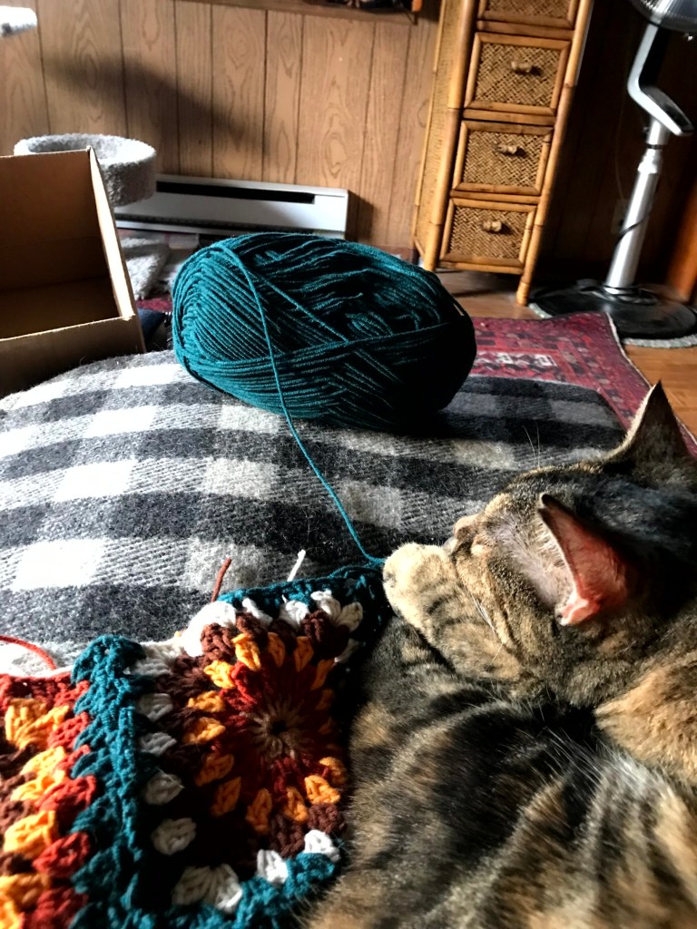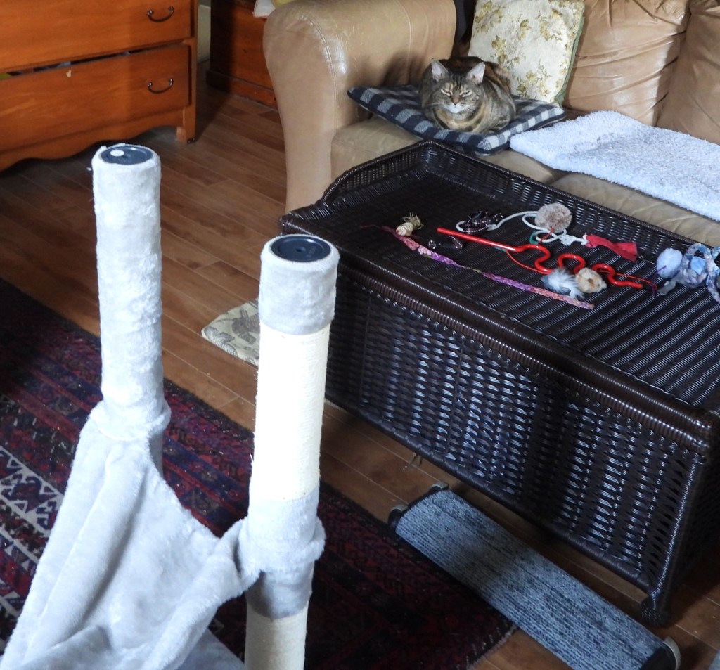Since the visit I have been complying with the diet instructions, and Miss M and I have been advancing along in getting to know each other. She especially likes to sit with me as I crochet. And is watching with interest as I assemble a “cat playground” to replace the old cat tree which has been scratched to shreds over the past 10 years.