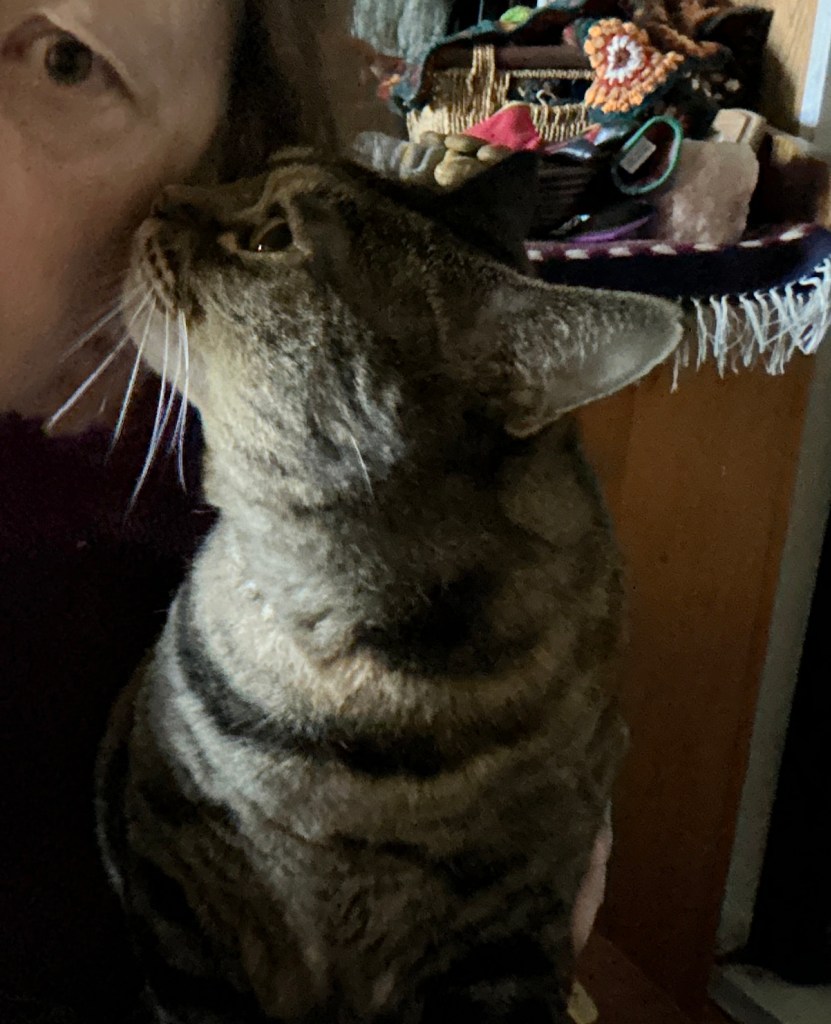 And how is Miss Moppet? She too has had her ups and downs. At last her claws were trimmed, thanks to the help of a neighbour, She is almost recovered from a bout of diarrhea which had me terrified and very busy washing bedclothes, litter boxes and trying in vain to connect with a vet who would supply me with gabapentin. I need this med to calm her down enough to get her into a safe state for transporting.